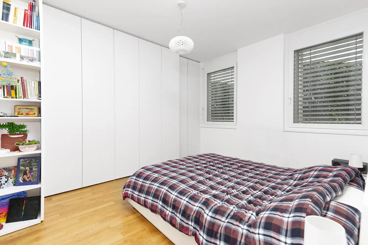 La doccia walk-in, con vetro a tutta altezza, è stata abbinata al gruppo rubinetteria con corpi a incasso in finitura cromo.