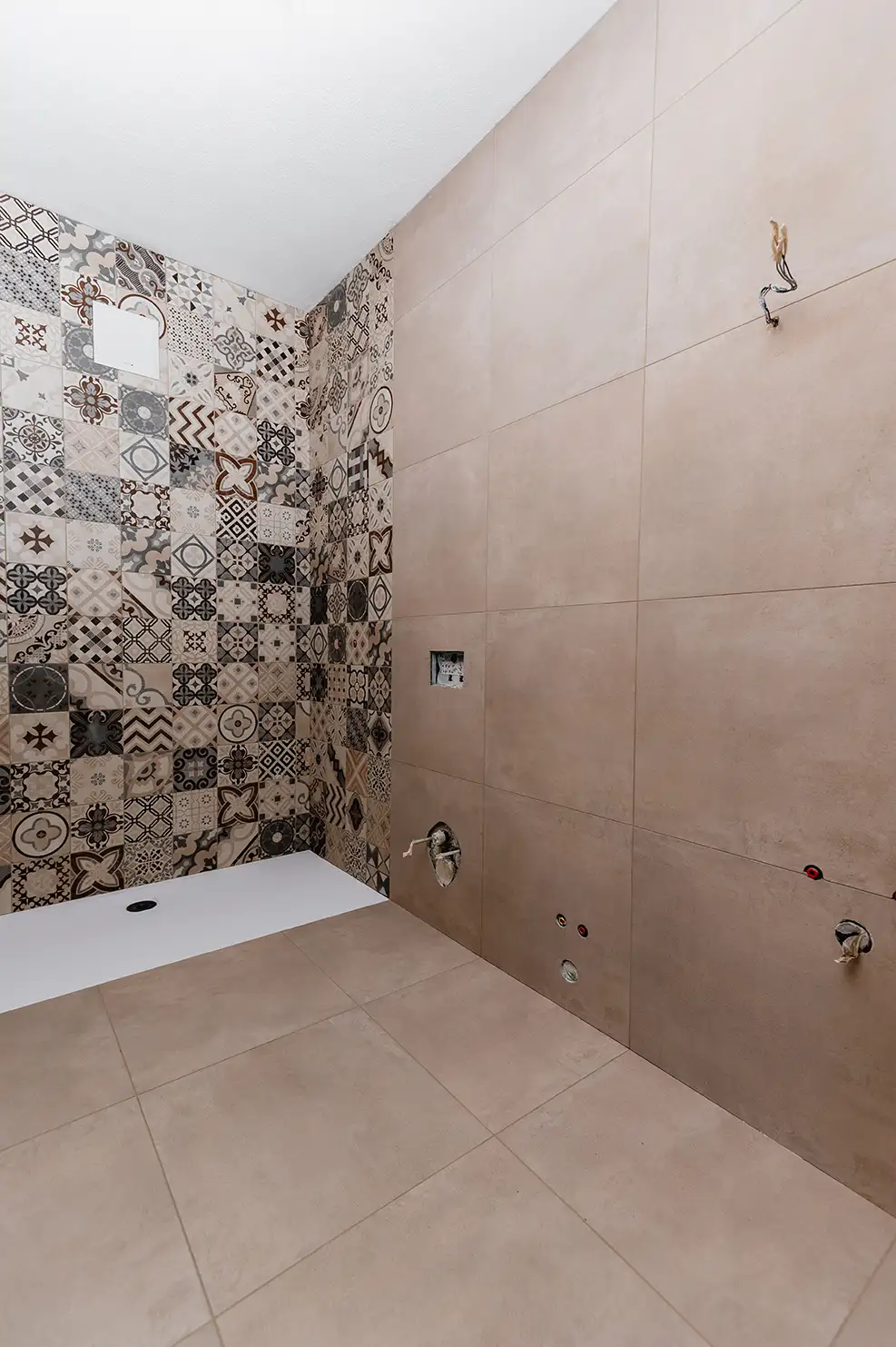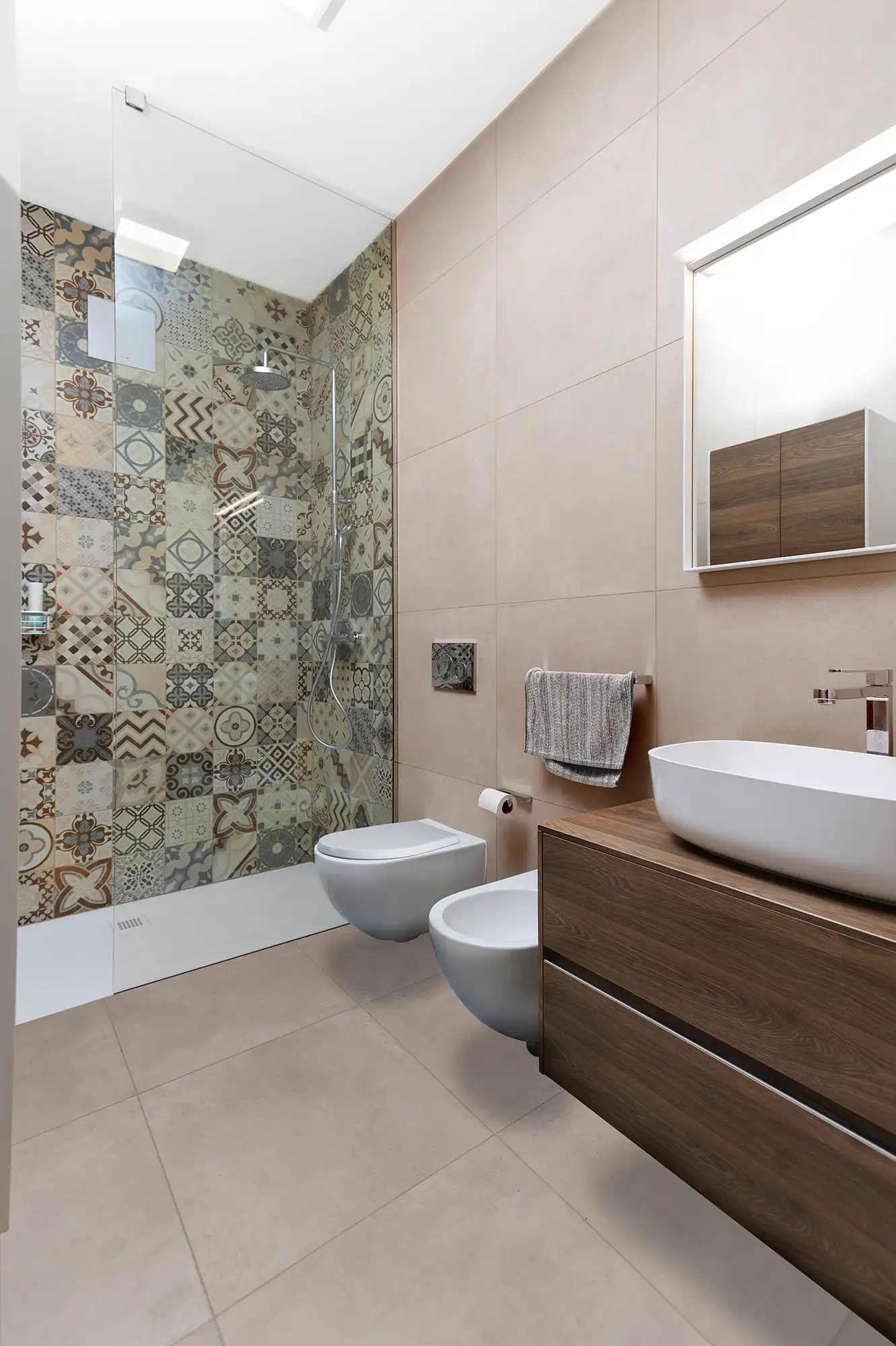 A farla da protagonista è il rivestimento doccia con cementine modello “Opus” di Casalgrande.