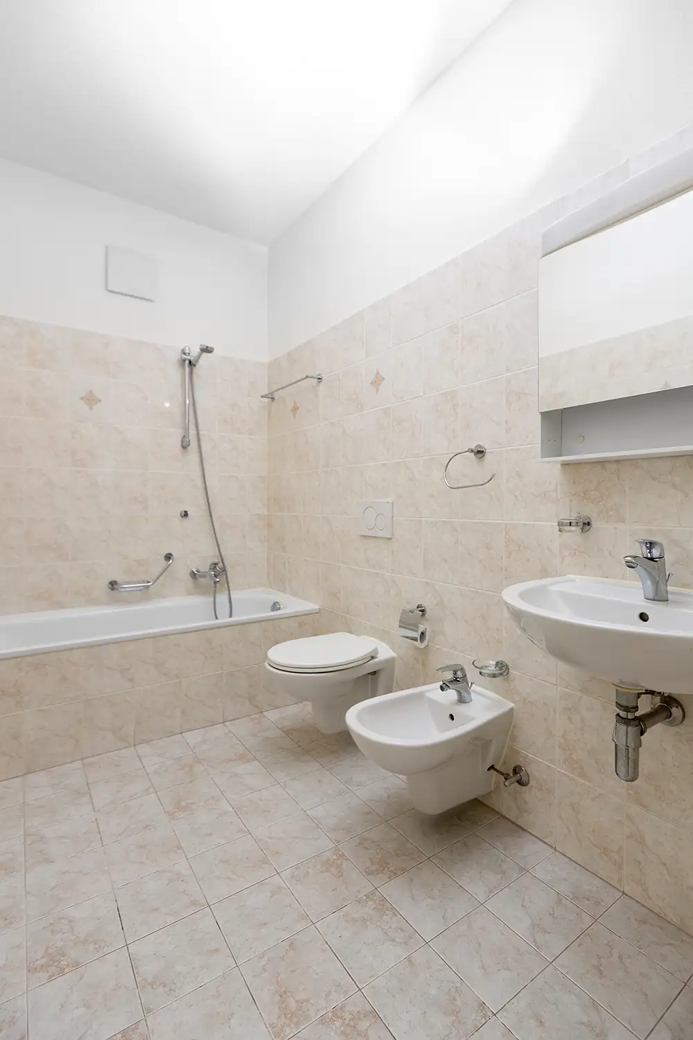 Per i pavimenti e rivestimenti laterali abbiamo optato per piastrelle effetto cemento tortora (formato 60×60) con fughe chiare.